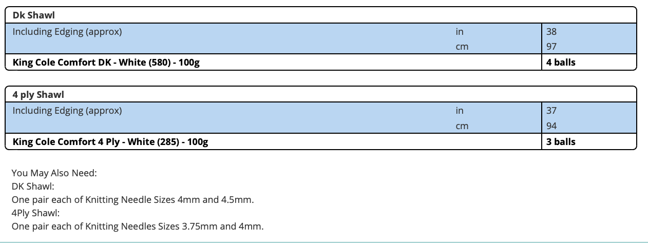 Zoom icon Click to expand Tap to zoom Chevron down icon Chevron down icon King Cole Pattern 3507 Baby Shawls in Comfort DK, or Comfort 4 Ply Save 0% €4,60 | / Availability: Translation missing: en.general.icons.icon_check_circle icon Only 1 left! 1 2 3 4 5 6 7 8 9 10+ Quantity Chevron down icon Quantity Add to cart Spinner icon This item is a recurring or deferred purchase. By continuing, I agree to the cancellation policy and authorize you to charge my payment method at the prices, frequency and dates listed on this page until my order is fulfilled or I cancel, if permitted. Notify me when back in stock Email address Email me when available King Cole Pattern 3507 Baby Shawls in Comfort DK, or Comfort 4 Ply