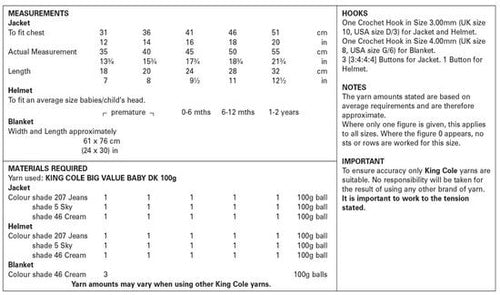 Zoom icon Click to expand Tap to zoom Chevron down icon Chevron down icon King Cole Pattern 5414 Crochet Baby Boy's Jacket, Hat and Blanket in Big Value Baby DK Save 0% €4,50 | / Availability: Translation missing: en.general.icons.icon_check_circle icon Only 1 left! 1 2 3 4 5 6 7 8 9 10+ Quantity Chevron down icon Quantity Add to cart Spinner icon This item is a recurring or deferred purchase. By continuing, I agree to the cancellation policy and authorize you to charge my payment method at the prices, frequency and dates listed on this page until my order is fulfilled or I cancel, if permitted. Notify me when back in stock Email address Email me when available King Cole Pattern 5414 Crochet Baby Boy's Jacket, Hat and Blanket in Big Value Baby DK
