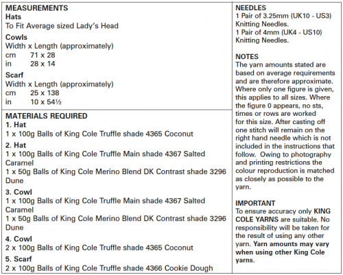 Zoom icon Click to expand Tap to zoom Chevron down icon Chevron down icon King Cole Pattern 5517 Hat, Cowls and Scarf in Truffle and Merino Blend DK Save 0% €4,50 | / Availability: Translation missing: en.general.icons.icon_check_circle icon Only 3 left! 1 2 3 4 5 6 7 8 9 10+ Quantity Chevron down icon Quantity Add to cart Spinner icon This item is a recurring or deferred purchase. By continuing, I agree to the cancellation policy and authorize you to charge my payment method at the prices, frequency and dates listed on this page until my order is fulfilled or I cancel, if permitted. Notify me when back in stock Email address Email me when available King Cole Pattern 5517 Hat, Cowls and Scarf in Truffle and Merino Blend DK
