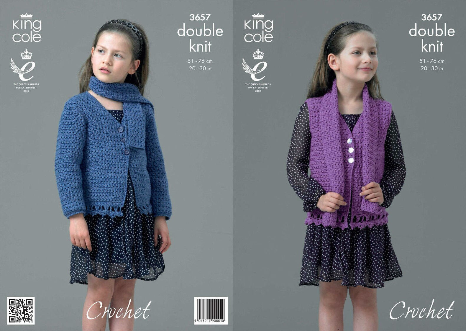 King Cole Pattern 3657 Girls Crochet Cardigan, Waistcoat & Scarf in DK