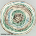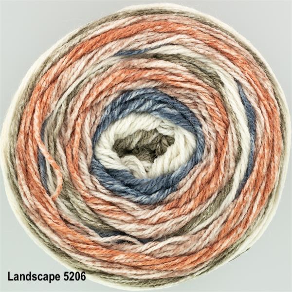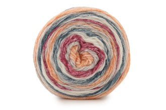 A standard 3-fold yarn which is spaced dyed, with an elongated colour repeating stripe.