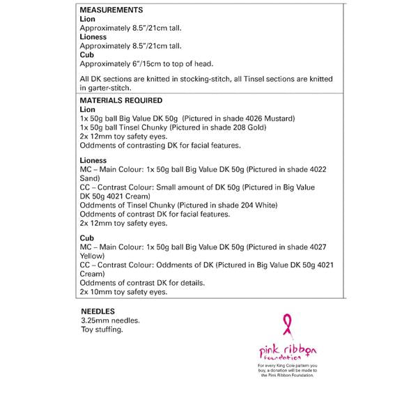 Zoom icon Click to expand Tap to zoom Chevron down icon Chevron down icon King Cole Pattern 9152 Lion Family in Big Value DK & Tinsel Chunky Save Liquid error (snippets/product-badge line 32): Computation results in '-Infinity'% €4,50 | / Availability: Translation missing: en.general.icons.icon_check_circle icon Only 2 left! 1 2 3 4 5 6 7 8 9 10+ Quantity Chevron down icon Quantity Add to cart Spinner icon This item is a recurring or deferred purchase. By continuing, I agree to the cancellation policy and authorize you to charge my payment method at the prices, frequency and dates listed on this page until my order is fulfilled or I cancel, if permitted. Notify me when back in stock Email address Email me when available King Cole Knitting pattern for Lion Family in Big Value DK & Tinsel Chunky