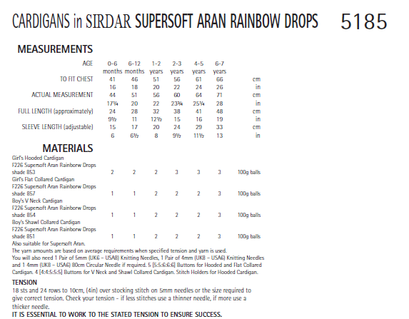 Zoom icon Click to expand Tap to zoom Chevron down icon Chevron down icon Sirdar Pattern 5185 Cardigans in Supersoft Aran Rainbow Drops Save 0% €4,50 | / Availability: Translation missing: en.general.icons.icon_check_circle icon Only 2 left! 1 2 3 4 5 6 7 8 9 10+ Quantity Chevron down icon Quantity Add to cart Spinner icon This item is a recurring or deferred purchase. By continuing, I agree to the cancellation policy and authorize you to charge my payment method at the prices, frequency and dates listed on this page until my order is fulfilled or I cancel, if permitted. Notify me when back in stock Email address Email me when available Sirdar 5185 Cardigans in Supersoft Aran Rainbow Drops